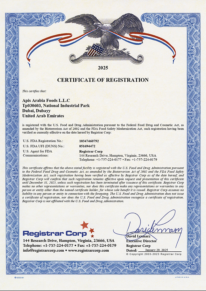 Arab League and GCC Certificates of Origin act as our golden passport, enabling duty-free exports of Honey of Arabia, while maintaining the strictest hygiene standards. This dedication to excellence culminated in Apis Arabia Foods LLC being the only natural honey company awarded the prestigious UAE Mark, a badge of honor that echoes our relentless pursuit of perfection.