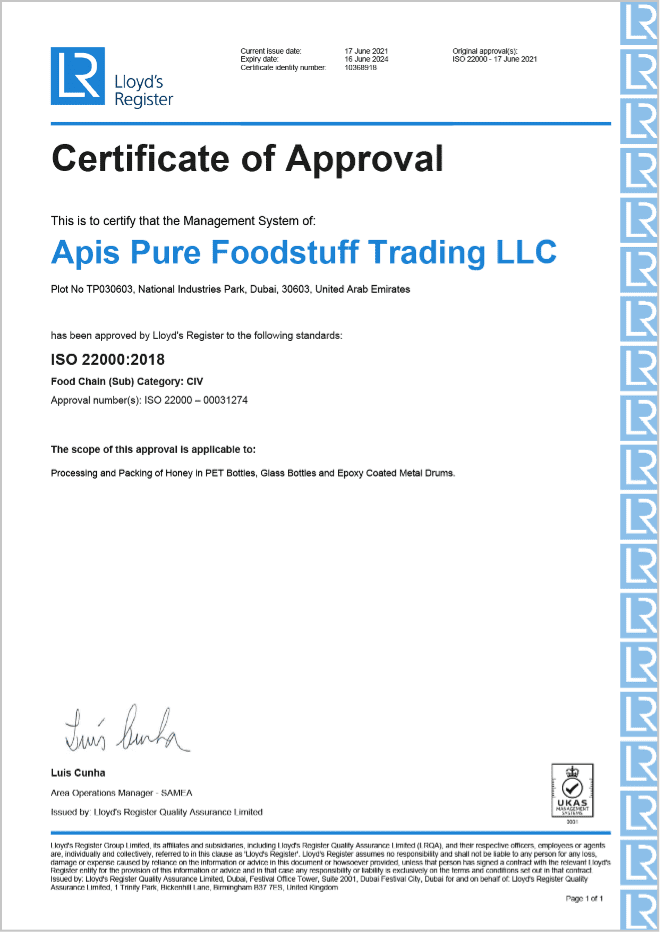 Since 1924, Apis has been a cherished name in the honey trade, weaving a tapestry of exquisite taste from the world’s finest honey in the world. Today, our state-of-the-art honey company in Dubai, operational since 2021, hums with the symphony of innovation, processing over 40 tons of Apis Honey daily. Apis Arabia Foods LLC boasts a glittering crown of certifications, including BRC, ISO, HACCP, USFDA, and SFDA — a testament to our unwavering commitment to highest quality honey.